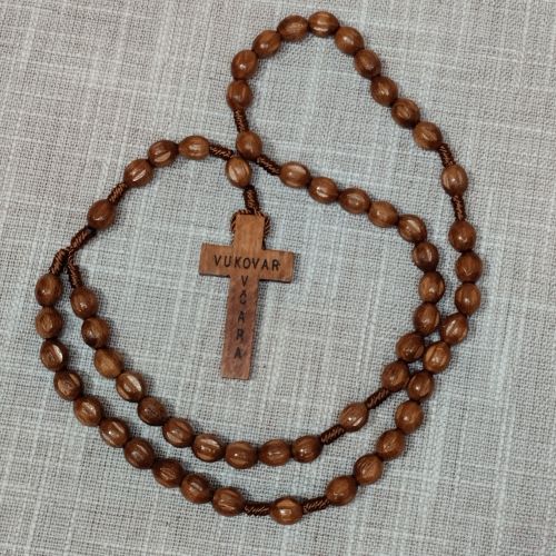 Drvena krunica izrađena je od visokokvalitetnih materijala koji osiguravaju njezinu dugotrajnost i otpornost na svakodnevnu upotrebu. Križ, na kojem je precizno ugraviran natpis Vukovar-Ovčara, odražava pažnju prema detaljima i namjenu prenošenja snažne poruke. Rukovanje ovom krunicom daje osjećaj prirodne topline drveta, što dodatno doprinosi njenoj simboličnoj vrijednosti.