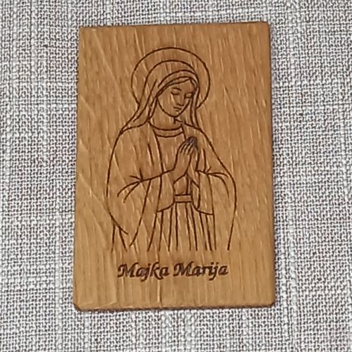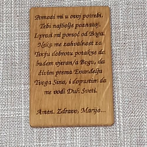 Kartica je izrađena od kvalitetnog hrastovog drveta, poznatog po svojoj čvrstoći i dugotrajnosti. Drvo je dodatno tretirano uljem za zaštitu, čime se osigurava otpornost na oštećenja i očuvanje prirodne ljepote materijala. Gravura na kartici je precizno izrađena kako bi detalji lika Majke Marije i tekst molitve ostali upečatljivi kroz godine.