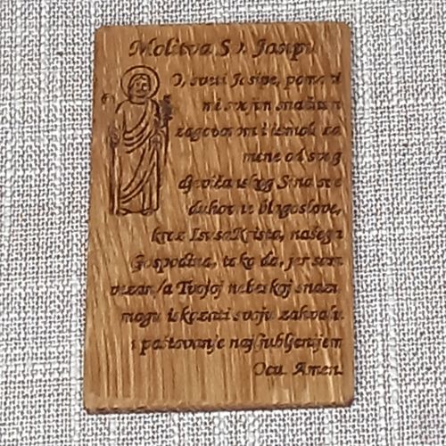 Otkrijte jednostranu drvenu molitvenu karticu s graviranim likom Sv. Josipa i molitvom posvećenom ovom zaštitniku obitelji. Ovaj pažljivo izrađen predmet predstavlja savršen spoj praktičnosti i estetike. Premium drveni materijal u kombinaciji s graviranjem rezultira proizvodom koji odiše kvalitetom i postojanošću. Kartica zrači simbolikom i može postati trajni podsjetnik na duhovne vrijednosti koje svakodnevno donose mir i nadu.