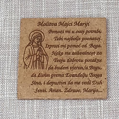 MDF (medijapan) materijal izabran je zbog svoje izdržljivosti i dugovječnosti, dok precizna gravura pruža jasnost detalja molitve Majci Mariji. Osim toga, završni premaz zaštitnim uljem naglašava prirodnu teksturu i štiti površinu od habanja. Ovaj proces ne samo da unapređuje estetiku magneta već osigurava i njegovu otpornost na vremenske utjecaje.