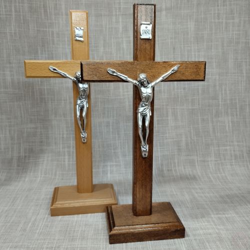 Drveni stolni križ s metalnim korpusom idealan je spoj tradicije i suvremene estetike. Zasnovan na kvalitetnom drvenom okviru s pažljivo izrađenim metalnim Kristovim korpusom, ovaj križ ne samo da odiše duhovnim značenjem, već i donosi eleganciju u bilo koji prostor. Njegov profinjeni dizajn čini ga idealnim za domove, urede ili sakralne prostorije.