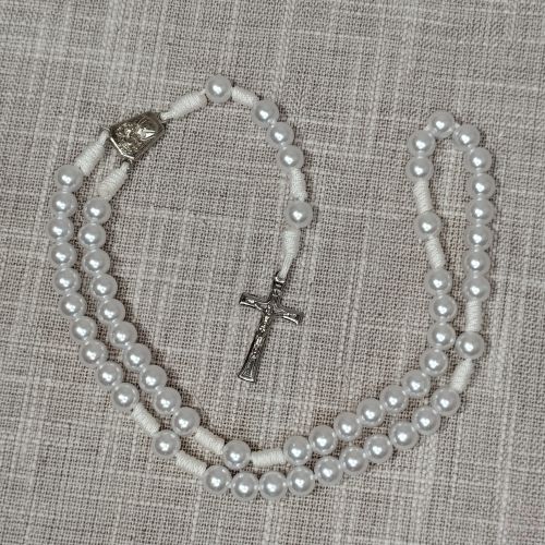 Krunica izrađena nizanjem plastičnih bisernih perli i s raskrižjem Marije Bistrice je savršen spoj estetskog dizajna i spiritualne simbolike. Ova jedinstvena krunica svojim izgledom privlači pažnju, dok njezina simbolička vrijednost pruža poseban trenutak unutarnjeg mira i povezanosti s vjerom.