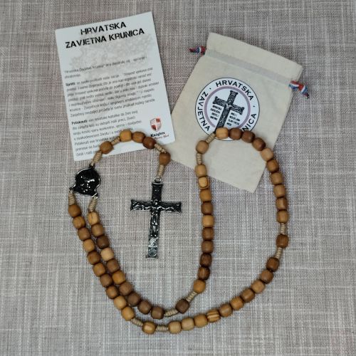 Hrvatska zavjetna krunica jest autentičan i poseban proizvod koji oživljava stoljetnu tradiciju hrvatskog naroda. Stojimo ponosni što nastavljamo ovu značajnu priču vjere i zajedništva, nastalu u suradnji s hrvatskom dijasporom iz Australije. Svaka krunica pažljivo je rukom izrađena, koristeći bobe autentičnog maslinovog drveta koje simbolizira mir i duhovnost. Ova jedinstvena izrada čini svaku krunicu posebnim artefaktom, savršenim poklonom za vaše voljene ili dragocjen dodatak osobnim molitvama. Ovo posebno izdanje ima raskrižje i raspelo izrađene od nehrđajučeg čelika.