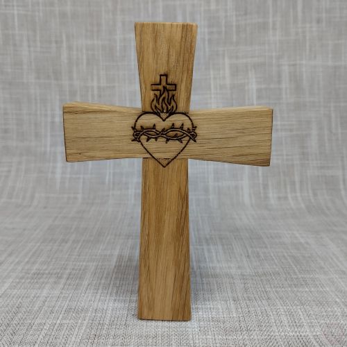 Posebnost ovog križa leži u elegantno graviranom Srcu Isusovom koji ističe njegov simbolički značaj. Gravura je izrađena uz maksimalnu pažnju prema detaljima, pružajući jedinstven umjetnički dodir ovom komadu. Kombinacija hrasta i precizne gravure stvara sklad koji spaja prirodu i duhovno značenje.