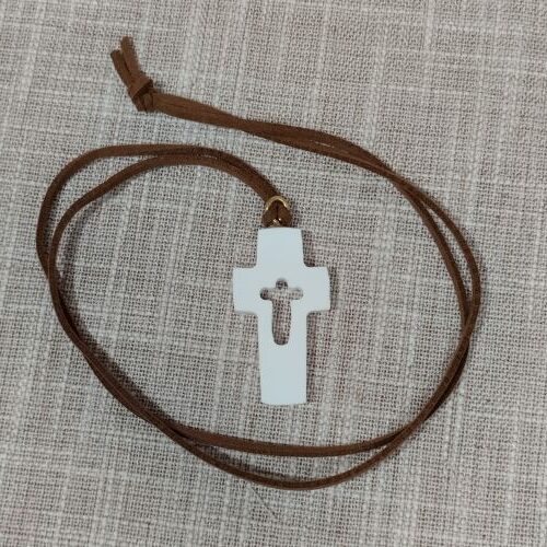 Ogrlica se sastoji od visokokvalitetne kože koja osigurava udobnost i dugotrajnost. Privjesak je izrađen od umjetnog kamena, u kojem je pažljivo izrezan stilizirani korpus. Detalji su precizni i naglašavaju umjetničku vrijednost ovog komada nakita. Kombinacija kože i umjetnog kamena daje ogrlici jedinstven i sofisticiran izgled. Raspelo od umjetnog kamena je otporno na habanje, osiguravajući da će vaša ogrlica zadržati svoj sjaj dugi niz godina.