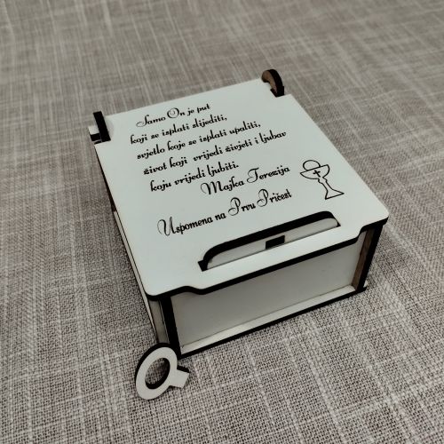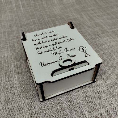 Naš proizvod, drvena kutijica za krunicu, savršeno objedinjuje estetiku i praktičnost. Izrađena od kvalitetnog MDF materijala, ova kutijica je dizajnirana da čuva vaše krunice na siguran i elegantan način. Prigodna laserska gravura dodatno doprinosi njenom jedinstvenom izgledu, čineći je savršenim izborom za poklon ili ličnu upotrebu.