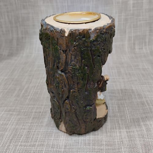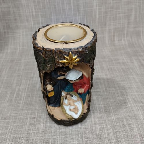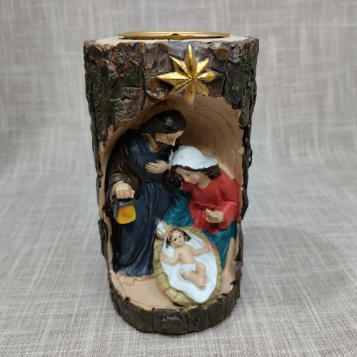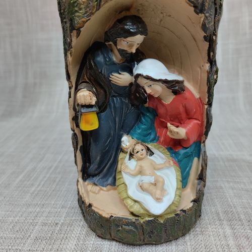 Ono što ovaj prikaz čini posebnim jest pažljivo izrađen reljef Svete obitelji u deblu od gipsa – prirodni motiv koji simbolizira stabilnost, skromnost i povezanost s prirodom. Na vrhu panja nalazi se udubljenje posebno dizajnirano za lučicu, čineći ga funkcionalnim ukrasom za svaku priliku. Bez obzira na prostor, ovaj ukras savršeno se uklapa u interijere, od modernih do tradicionalnih.